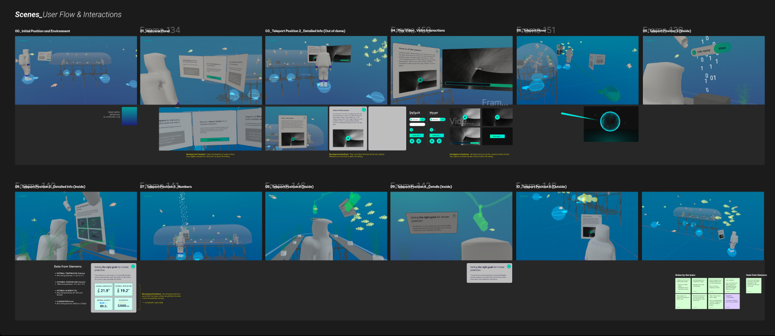 My workflow: Due to the project timeline (4 weeks start to delivery), development, technical artistry and experience design pieces of the project were orchestrated in parallel. Even though communication among us was crucial, we tried to facilitate in a fast and efficient manner. Analyzing this, I decided to create less sophisticated version of the initial 3D models we received and use these as wireframes (such as the diver, underwater dome environment) and add objects as placeholders as I progressed. Creating my panels in Figma, I used ShapesXR to bring all the models and panels together. I created 6 scenes to express the experience user would go through in different ‘teleport points’ within the underwater environment.